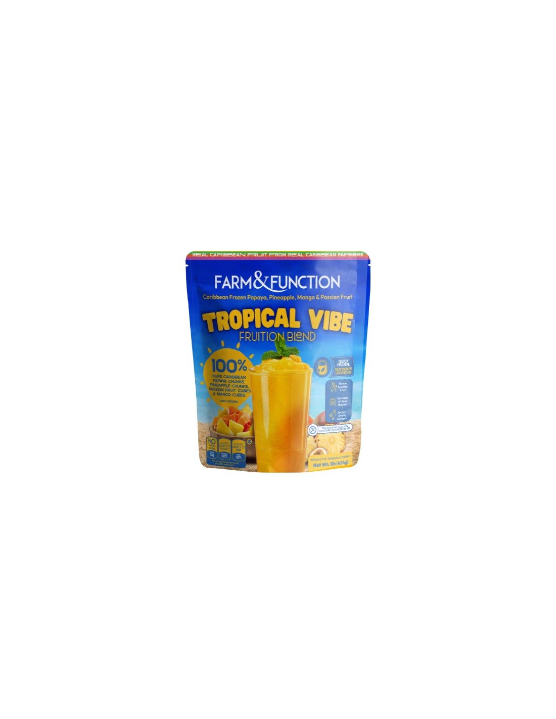 Tropical Vibe Frozen Fruit Mix creates the perfect tropical Smoothie! Farm & Function is the only 100% locally grown frozen fruit product in T&T! Support local farmers and your community today by enjoying our 100% frozen fruit packs with zero preservatives or additives! Each pack makes 4 x 16oz smoothies.