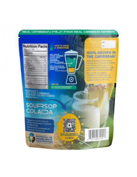 Frozen Soursop Cubes creates the perfect tropical Smoothie! Farm & Function is the only 100% locally grown frozen fruit product in T&T! Support local farmers and your community today by enjoying our 100% frozen fruit packs with zero preservatives or additives! Each pack makes 4 x 16oz smoothies.