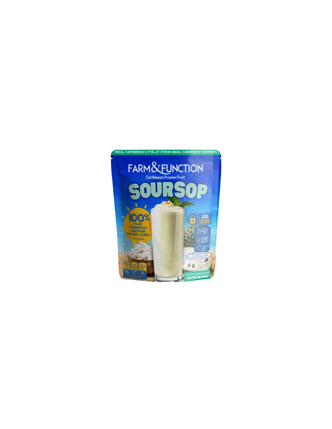Frozen Soursop Cubes creates the perfect tropical Smoothie! Farm & Function is the only 100% locally grown frozen fruit product in T&T! Support local farmers and your community today by enjoying our 100% frozen fruit packs with zero preservatives or additives! Each pack makes 4 x 16oz smoothies.