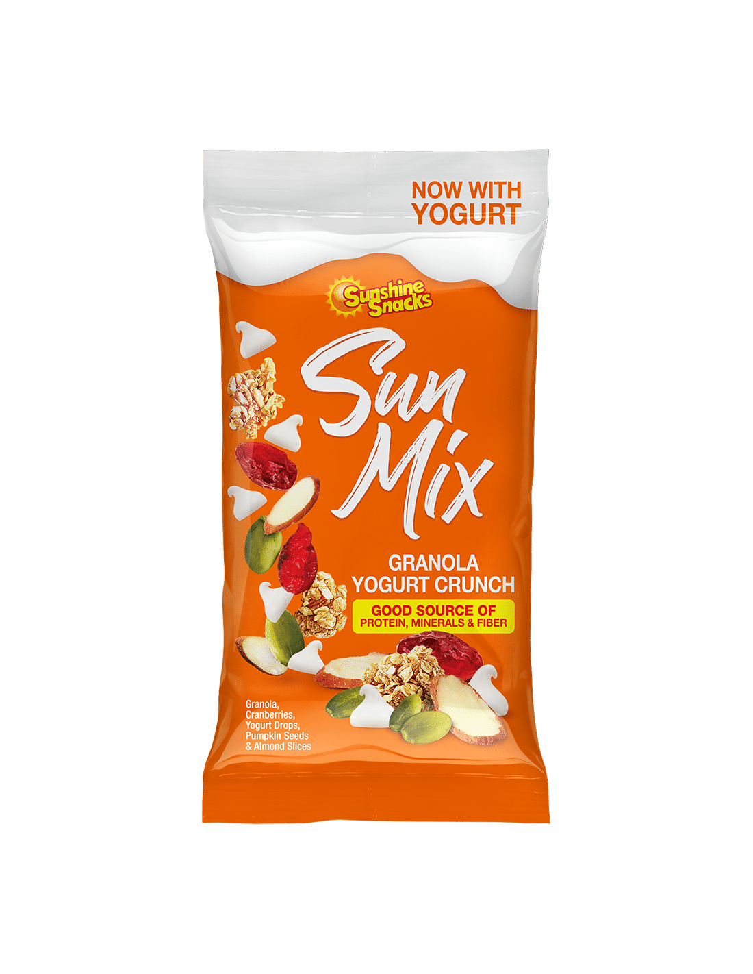 Ingredients: Granola (rolled oats),sugar, canola oil, rice flour, corn syrup, sunflower seeds, wheat flour, salt, soy (lecithin), dried cranberries, (cranberries, sugar, sunflower oil), almonds, yogurt chips, (sugar, palm kernel oil, whey powder, yogurt powder, (whole milk powder, lactic acid, citric acid, bacterial culture), powdered whey, protein concentrate, soy lecithin, natural flavor, sorbitan tristearate). dried pumpkin seeds.